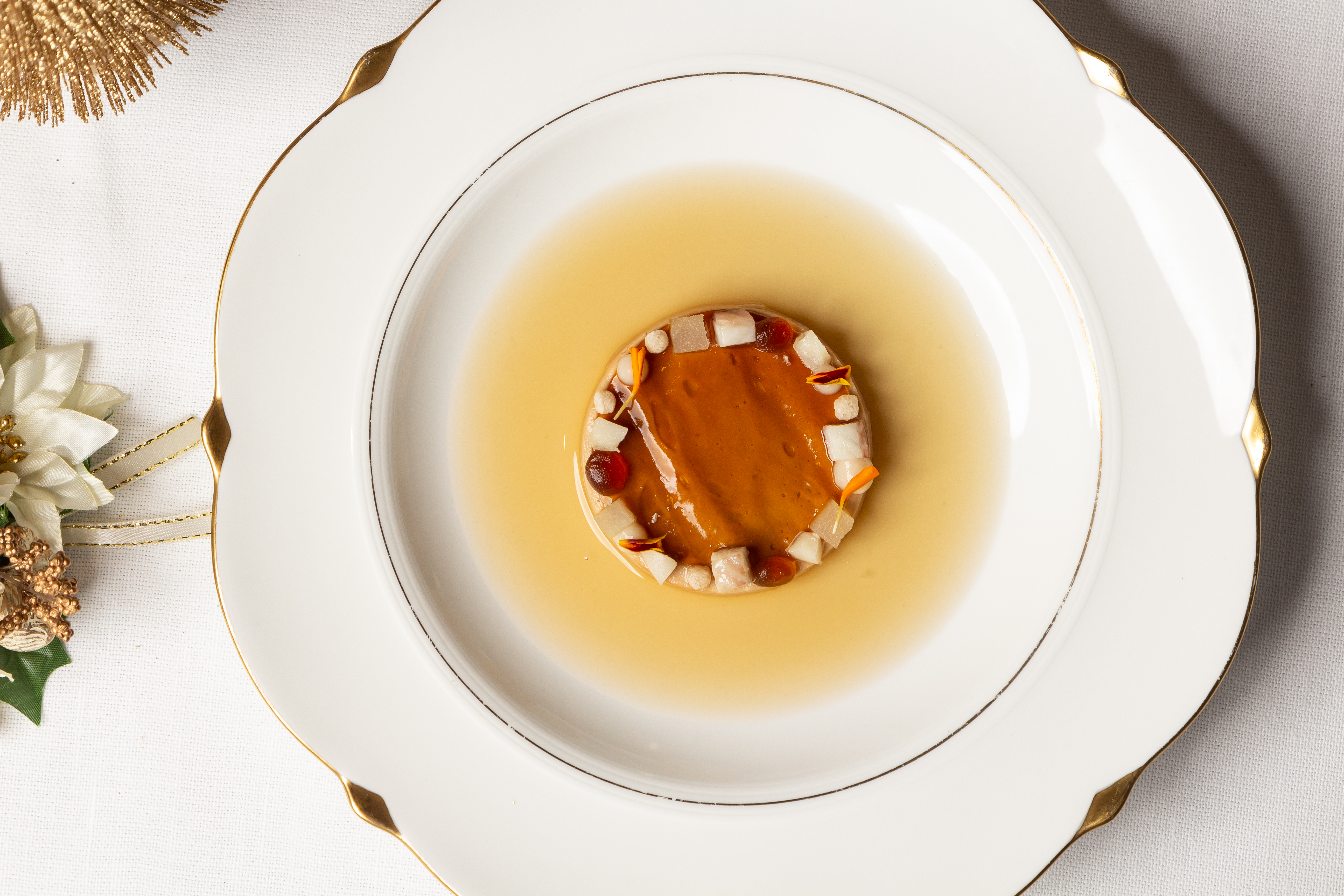 El chef Jorge González ha preparado en L´Atelier de Robuchon un riquísimo menú de Nochevieja con deliciosos productos como el caviar y platos como el carpaccio de vieiras con trufa blanca de Piamonte, lubina en escama calabacín y su flor rellena de setas en escabeche o solomillo en costra de pistacho, salsa de chalotas y puré de castañas.